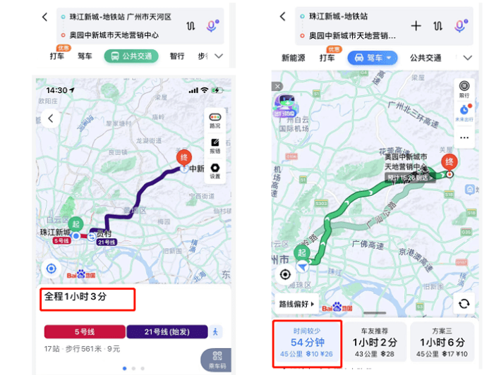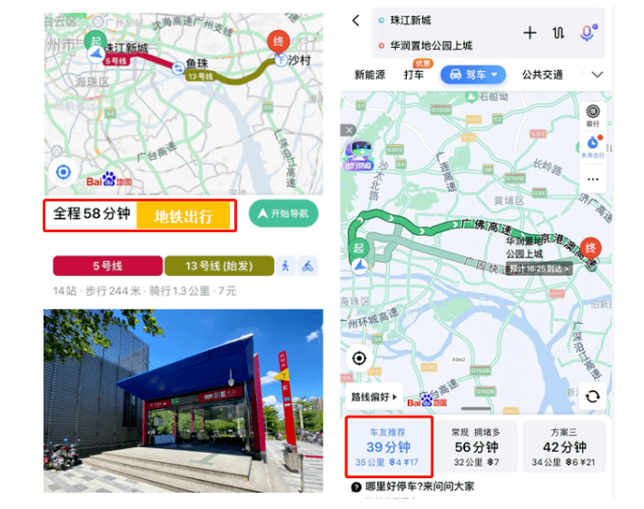 而驾车出行则更加友好,较快40分钟可达。
