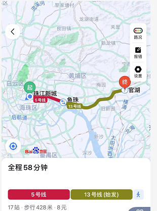 在交通方面,作为TOD项目,近地铁是必须的。星图位于13号线官湖站B出口旁,地铁换乘5号线到珠江新城约58分钟。另外13号线二期预计2024年建成,通车后可直达花城广场,出行将更加便捷。