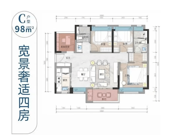 98平4房2厅2卫:大面宽横厅,不浪费多余空间;主卧套房设计,步入式衣帽间,隐私感加强;餐厅配有飘窗,采光不错,尺寸阔绰,生活品质大大提升。