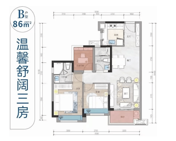 85平3室2厅2卫:三房带主套+入户花园,兼得实用与舒适,三开间朝南,转角全景飘窗,提升光线和空间感。