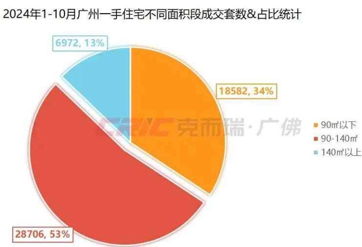 克而瑞数据监测显示,今年1-10月广州一手住宅+二手房累计成交14.21万套,其中一手住宅成交54260套,按照面积段划分,90-140㎡为成交主力,共成交28706套,占比53%,90㎡以下一手住宅成交18582套,占比34%,140㎡以上成交6972套,占比13%。