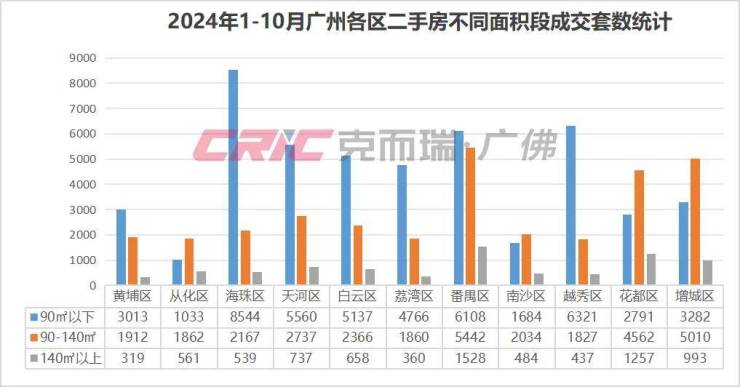 140㎡以上户型番禺、花都两区二手房成交在1000套以上,高居全市前列,其中番禺区高达%的市场份额,今年1-10月广州二手房所有面积段里占比最高的。