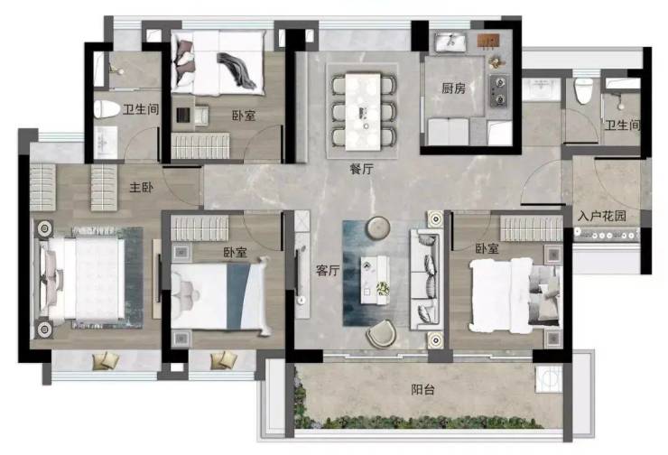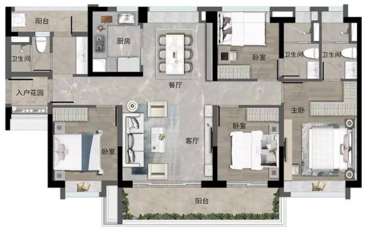 建面约123㎡四房依然是竖厅设计,但该户型的景观阳台连通客厅和次卧,四开间朝南,南北通透,采光和空气流通要更好些。