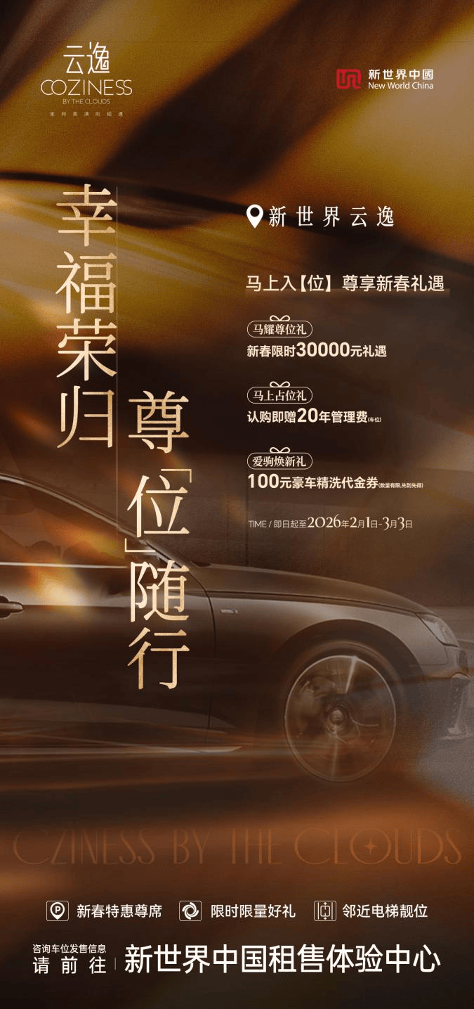新春金喜云逸地库车位享限时30000元购位礼、认购即赠20年车位管理费及价值100元爱车焕新礼!