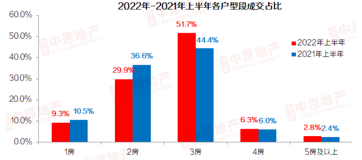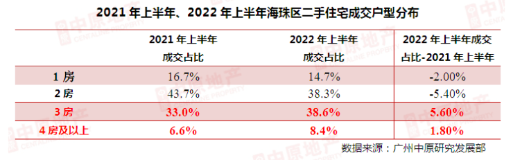 据中原成交大数据显示,海珠区3房、4房及以上的改善型户型成交占比分别出现明显回升,占比分别大增至38.6%、8.4%,同比2021年上半年分别净增5.6%、1.8%。