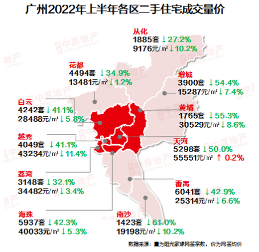 2022年上半年,天河区二手住宅成交宗数(中介网签+自助网签)为5298宗,同比下降50.0%;而二手住宅网签均价为55551元/平。