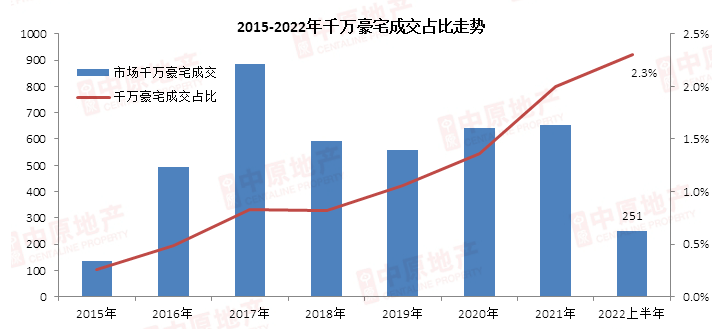 尤其在疫情之后,豪宅成交占比更是猛增,从2020年的1.4%,跃升至2022年上半年的2.3%,净增0.9%。