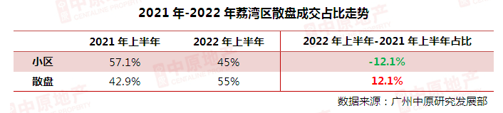 据中原成交大数据显示,2022年上半年荔湾区散盘成交向好,活跃度明显较去年同期高。其成交占比为55.0%,同比净增12.1%。