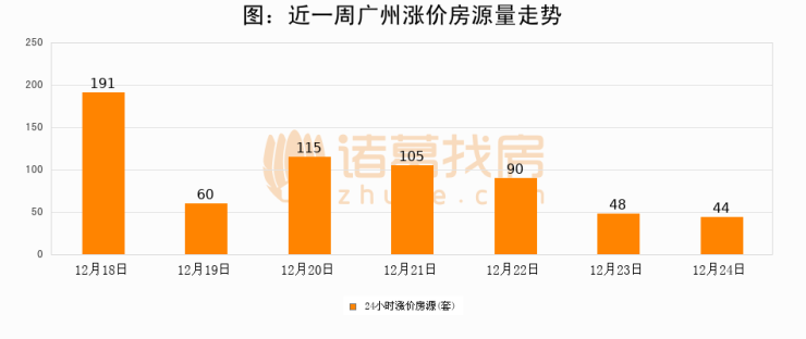 根据诸葛找房数据显示,广州24小时涨价房源量为44套,较12月23日减少4套,环比下降8.3%。与此同时,涨价房源占比小幅回落,对于购房者来说是一个入市窗口期,购房者可抓住时机入市。