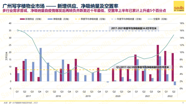 本季,广州甲级写字楼市场租赁需求显著缩减,多个子市场均有大面积租户撤租现象出现,全市季度净吸纳量自疫情首次爆发以来再次转负,并跌至近十年较低值(-2.6万平方米)。受此影响,全市平均空置率环比再升3.1个百分点,至14.9%,开年两个季度已累计上升逾5个百分点。