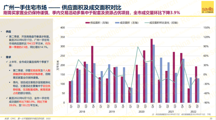 第二季度,开发商推盘节奏逐步恢复。截至2022年6月17日,广州一手住宅市场供应面积达194.5万平方米,约为排名前列季度的2.5倍,同比增长14.1%。