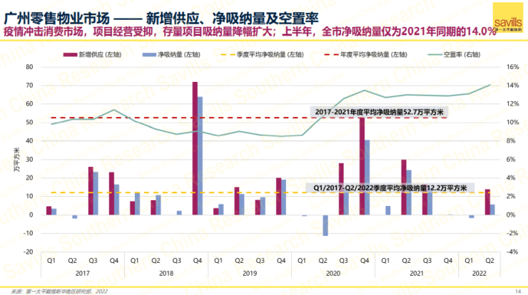 季内,疫情冲击消费市场,亦令项目经营受抑,存量项目吸纳量环比降幅扩大。尽管因新项目开业入驻率较高,并支撑全市季度净吸纳量转正,但仅为2021年季均水平的51.6%。多数商圈空置率亦相应波动上升,全市空置率环比上升0.9个百分点,至14.1%。