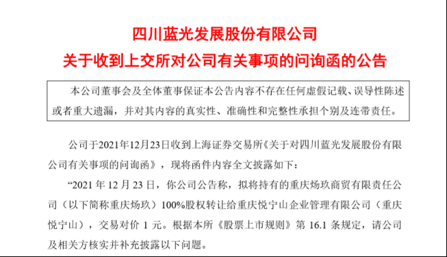 12月23日,蓝光发展披露上海证券交易所关于对四川蓝光发展股份有限公司有关事项的问询函。同一天,蓝光发展公告称,拟将持有的重庆炀玖商贸有限责任公司100%股权转让给重庆悦宁山企业管理有限公司,交易对价1元。