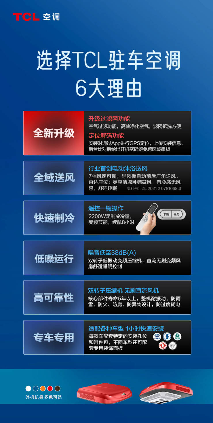 TCL空调深耕空调领域,除了专注行业领先的家用空调、中央空调外,已逐步向驻车空调产业方向布局、延伸。TCL驻车空调延续TCL空调的高品质、高可靠,实现了高效节能、超级静音、极速制冷的产品特性,正成为越来越多卡友的选择。