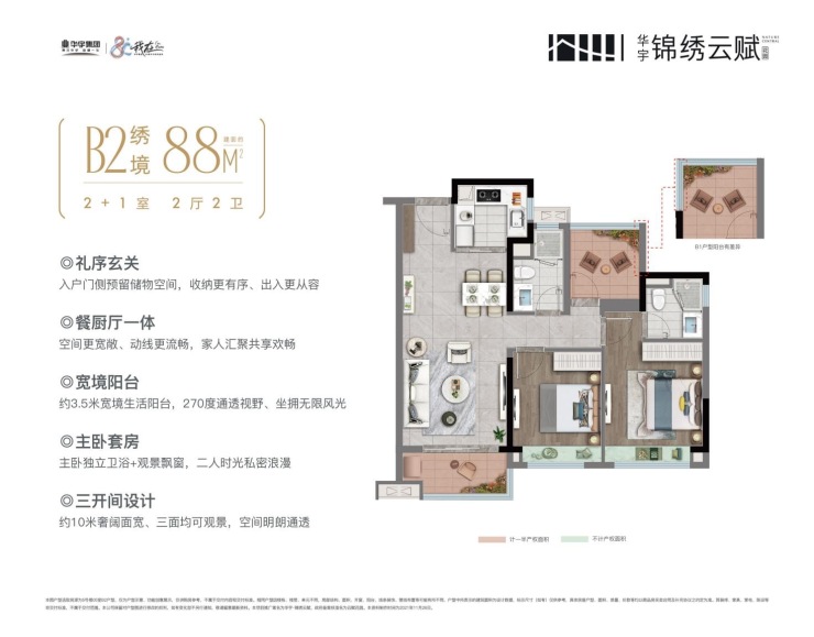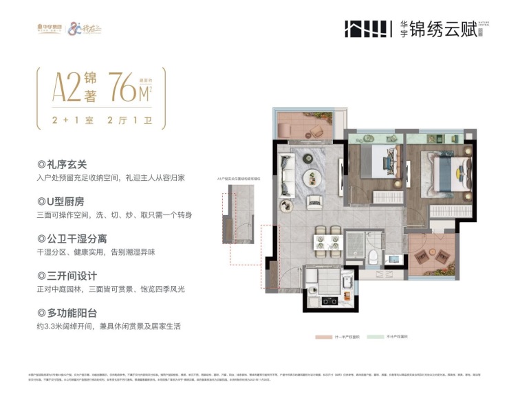 现场与示范区同步公开的,还有华宇·锦绣云赋建面约76㎡、约88㎡两大户型样板间:建面约76㎡户型,可变2+1房2厅1卫,通透的三开间格局、客餐厅一体化设计,充分放大居住舒适度;预留玄关收纳、U型厨房、公卫干湿分离,极大提升生活效率;此外,约3.3米客厅开间、约1.4米阳台进深,在设计时就充分兼顾了尺度与功能,专为城市年轻人群而生。