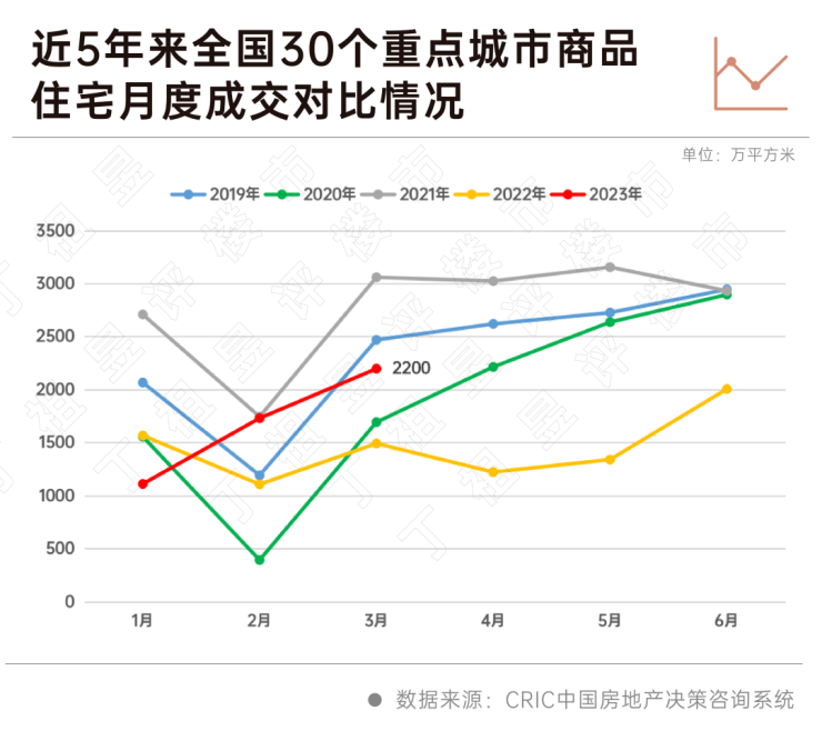 CRIC数据显示,2023年一季度30个监测城市成交面积累计同比上涨21%,其中3月恰逢传统营销旺季,重点30城供应爆发,环比大增164%,受其影响,30个城市成交规模为2200万平方米,环比再增27%,与历年同期对比,略好于2020年和2022年。