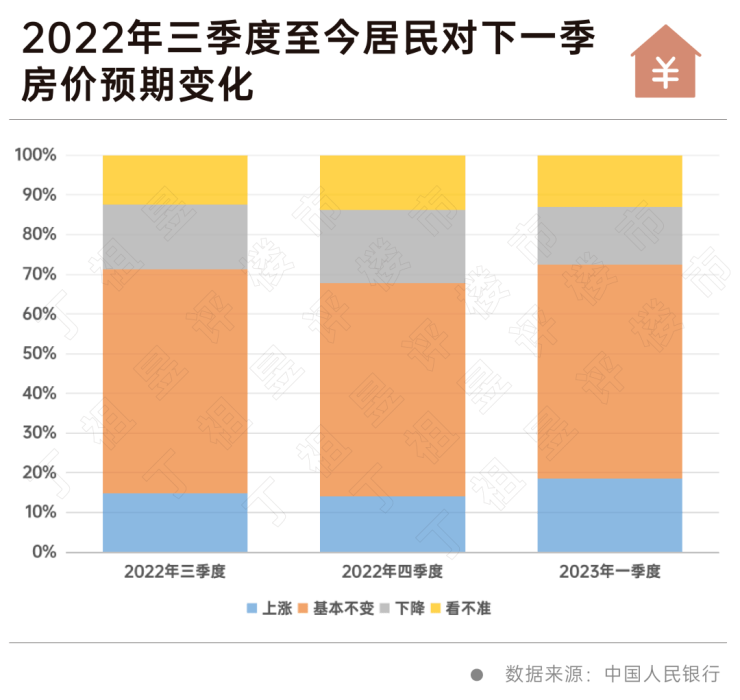中国人民银行4月3日公布的《2023 年第一季度城镇储户问卷调查报告》显示,18.5%的居民对下季房价预期“上涨”,较2022年第四季度14.0%上升4.5个百分点,问及未来三个月准备增加支出的项目时,17.5%居民选择购房,较2022年第四季度16%上升1.5个百分点。