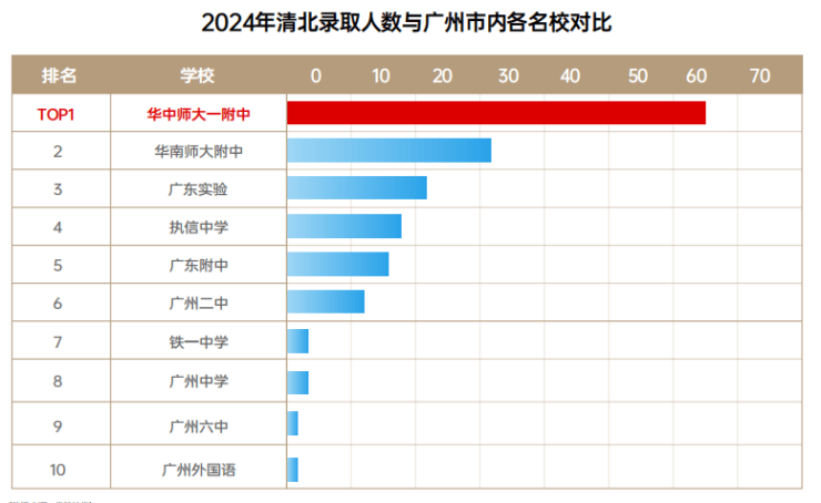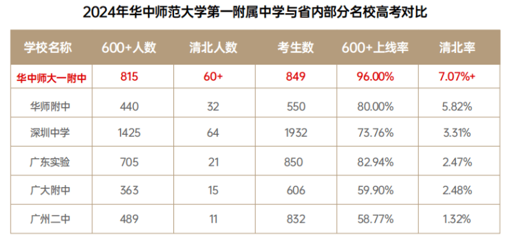 而据媒体公开数据,同在2023年,广州本土顶流名校华南师大附中的一本上线率约96%,执信中学和广州二中的一本率皆约为93%,广大附一本率约90%。清北率更是让其他中学望尘莫及。数据显示,2023年华中师大一附中高考700分以上高达13人,占湖北省700分以上总人数(38人)的约三成,清北录取人数高达70人。即便把时间拉长点,该校在过去三年平均每年有约70-80人进入清北等顶级高校,远远高于广州本土名校。