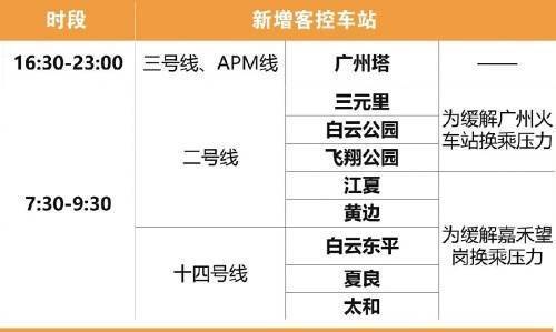 据介绍,这9个站分别是三号线的广州塔站、APM线的广州塔站;二号线的三元里站、白云公园站、飞翔公园站;二号线的江夏站、黄边站及十四号线的白云东平站、夏良站、太和站。在大客流的情况下,车站通过在站厅、出入口等区域采取分批放行或绕行的方式进行限流,减缓乘客进入站台的速度,保证出行安全。