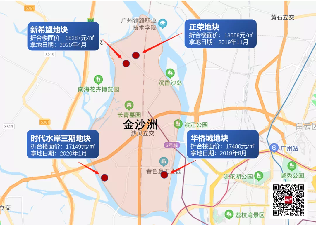 另一方面,近两年来金沙洲佛山片区卖地不少,个别地块楼面价都已达到1.8万元/㎡,无疑将带动新房供应量的增加。其中,新希望地块项目(项目名:新希望奥园·金沙公馆)、华侨城地块项目(项目名·:华侨城天鹅堡)将于近期入市,地理位置较为优越,备受市场瞩目。