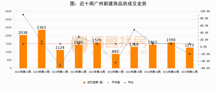 进入2023年第51周(12月11日-12月17日),广州新建商品房成交1275套,较上周减少315套,环比下降19.8%