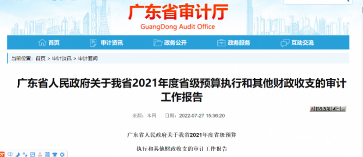 近日,广东省审计厅网站发布《广东省人民政府关于我省2021年度省级预算执行和其他财政收支的审计工作报告》全文。