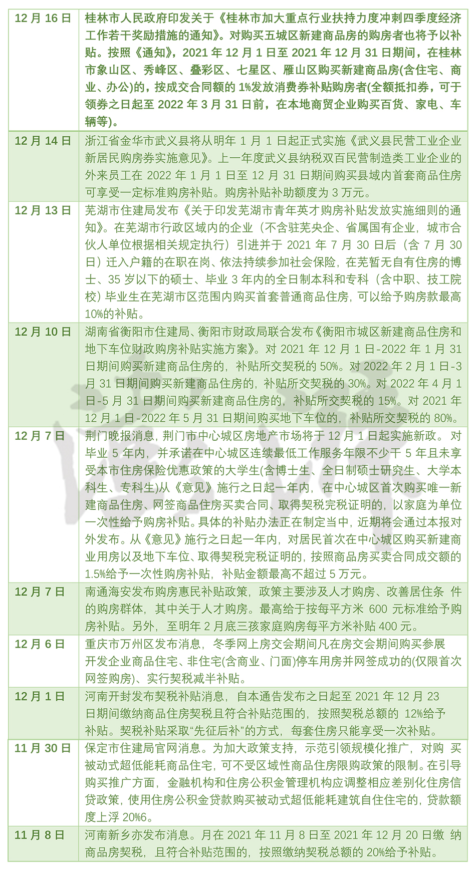 例如,桂林是对2021年12月1日至2021年12月31日期间,在桂林市五城区购买新建商品房(含住宅、商业、办公)的,按成交合同额的1%发放消费券补贴购房者。