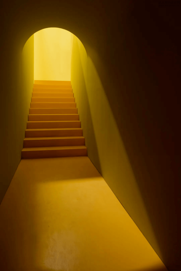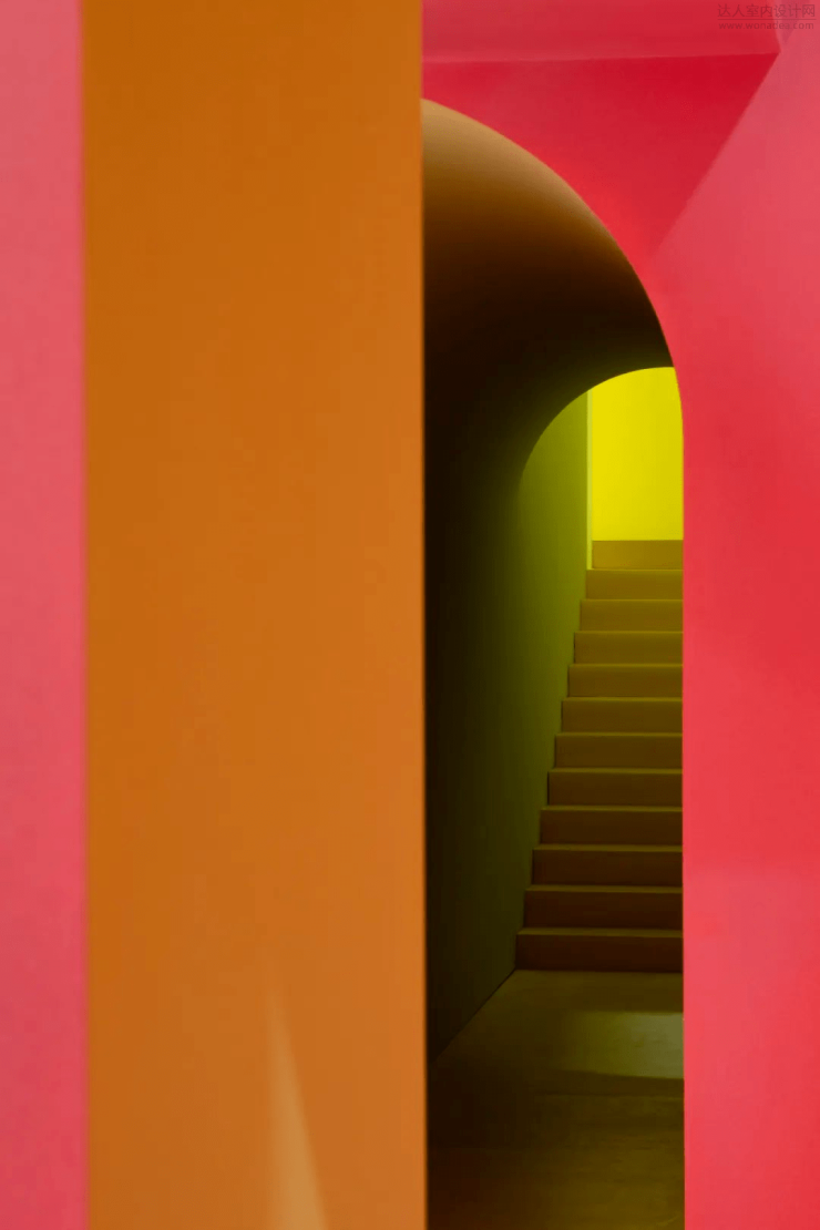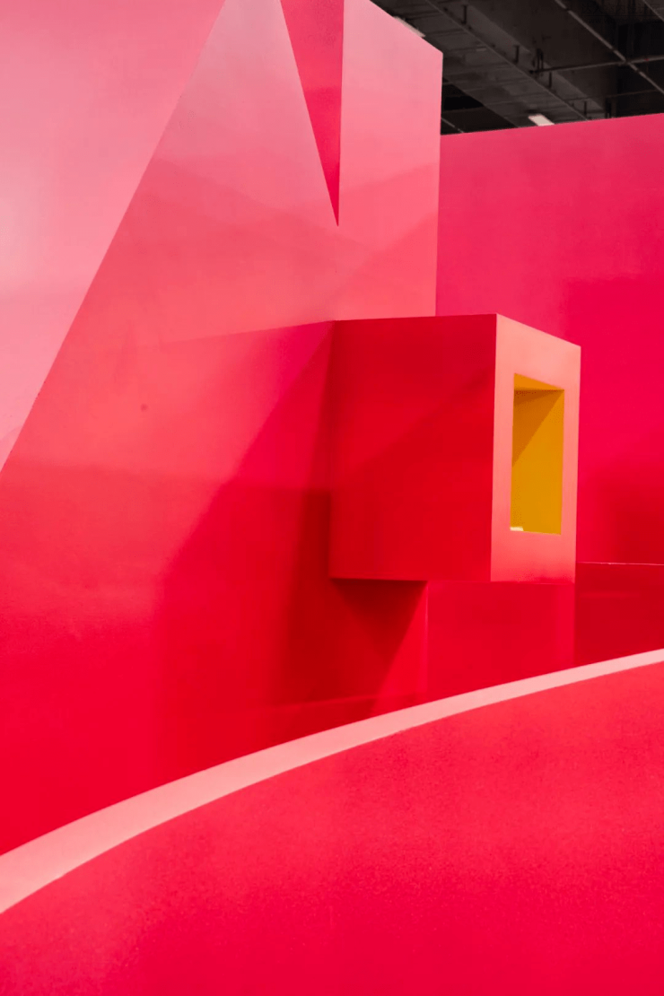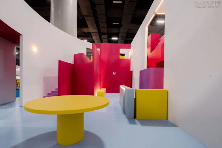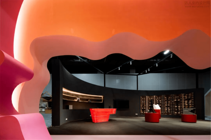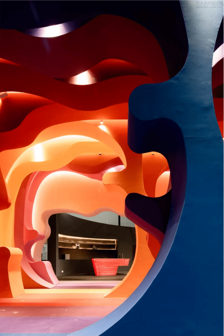 在展厅的设计中,设计师尝试将博尔赫斯小说《小径分岔的花园》具象化,如同莫比乌斯环有着无穷的动线,用色彩与材质来区分不同的区域,不同的色彩象征着不同的心境。让人们在里面自由的行走,分岔,休憩,以及再次相遇。