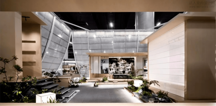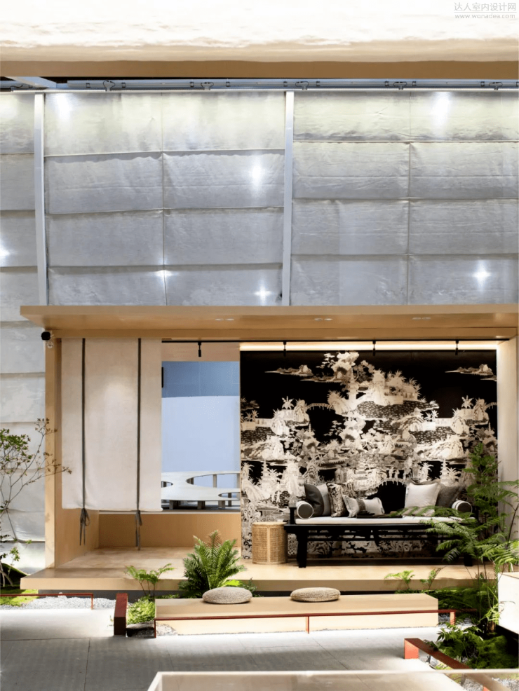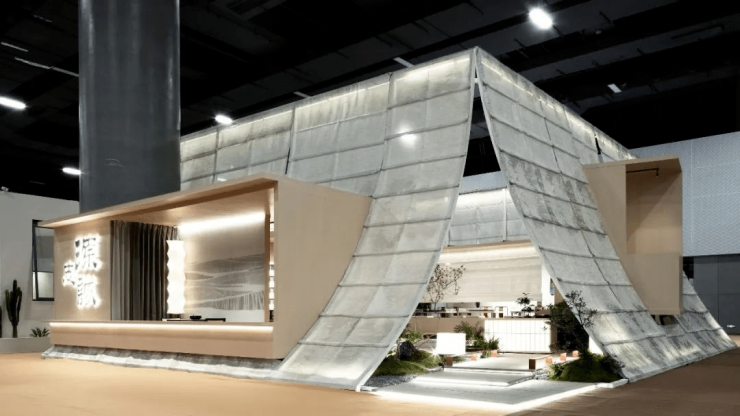 展厅被命名为「凭栏水榭」,设计将建筑美学与布艺美学相结合,通过对岭南文化语言的转译,实现跨学科的美学结合。展馆由低平的台,围合出一个个空透,畅达的展示「水厅」,营造出独属于岭南园林的特色氛围,使观赏者可以在由布艺为主题材料的空间闲庭漫步。