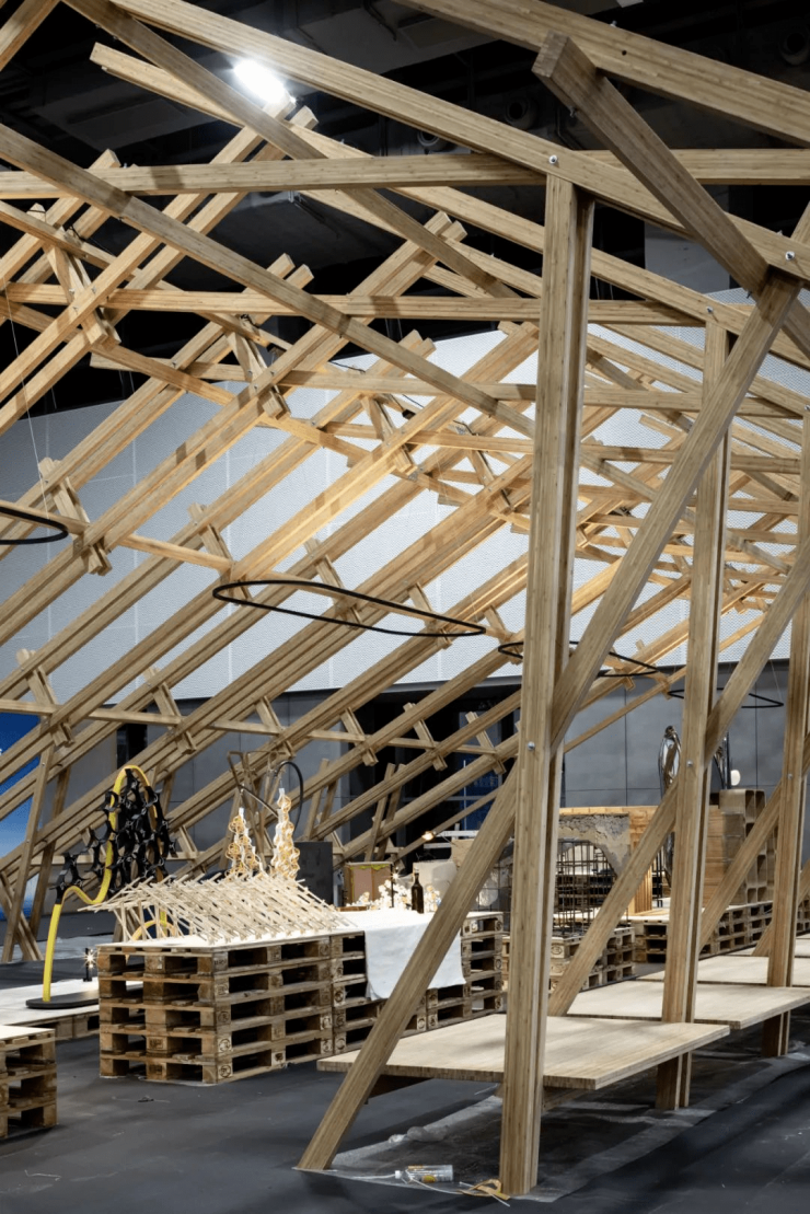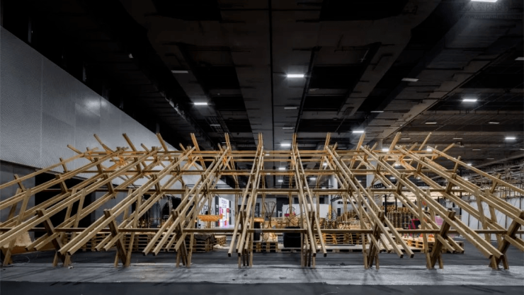 在此次盛会中,「材料晒场」设计原创实验室,搭建了一处跨界的舞台,旨在让人们感受材料的多种可能性,以及设计师们的多元跨界表达。绽放设计与森泰竹木合作完成了「材料晒场」展厅的设计落地,光引未来、Ostuni团队的灯光设计,点亮展厅。