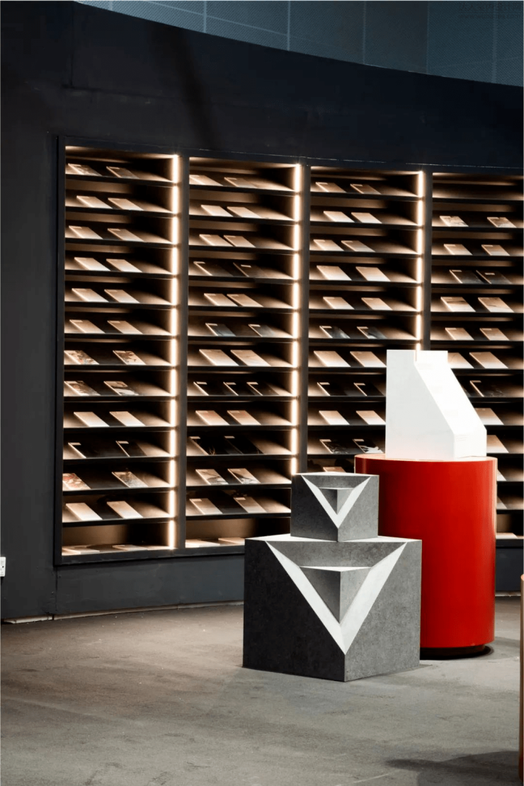 唯美展厅的设计围绕设计与探索展开,「X」代表未知和更多可能性,空间以层层递进的多彩空间展现想象力的无限延伸。空间内的石材装置呼应着品牌岩板产品的材质渊源,两处截然不同的空间体验创造出更多可能性,邀约来访者共赴一场美好的创意盛宴。
