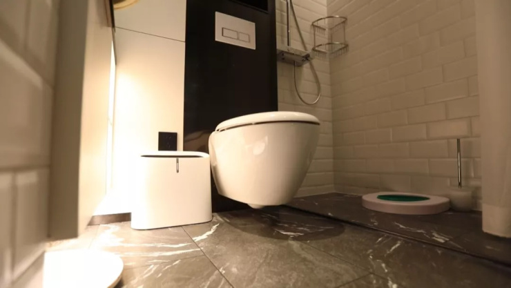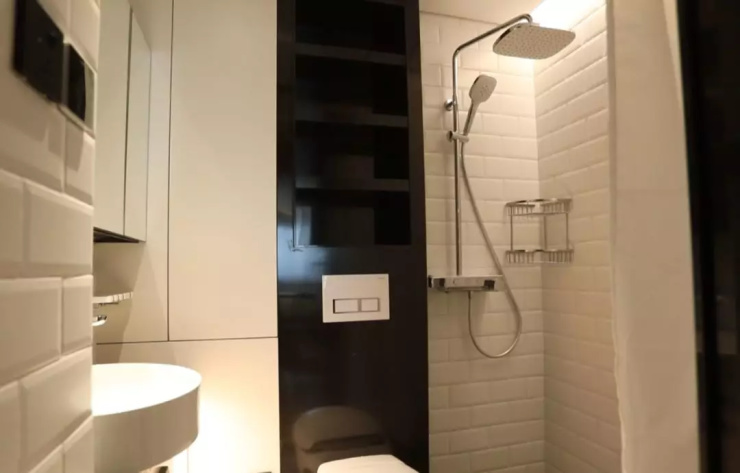 设计师经过多番构思,最终决定使用恒洁挂壁式马桶,它的水箱是隐藏的,占用空间比较小,能争取到25cm的污水管道高差,再通过抬升全屋地面,剩下的5cm下水管道高差也得以消除,从而解决卫浴间的高差问题。同时,设计师还加装了许多卫浴设施,让卫浴间看起来焕然一新,用起来舒适贴心。