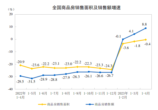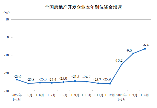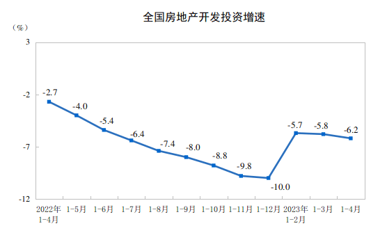 日,国家统计局发布2023年1-4月份全国房地产市场基本情况。数据显示,1-4月份,全国房地产开发投资约3.55万亿元,同比下降6.2%,累计降幅较上月扩大0.4个百分点。由此可见,虽然行业资金压力缓解,但是房企新开工意愿不足。