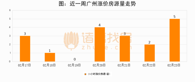 根据诸葛找房数据显示,广州24小时涨价房源量为5套,较02月22日增加3套,环比上涨150%。与此同时,涨价房源占比小幅扩大,业主信心有所提升。