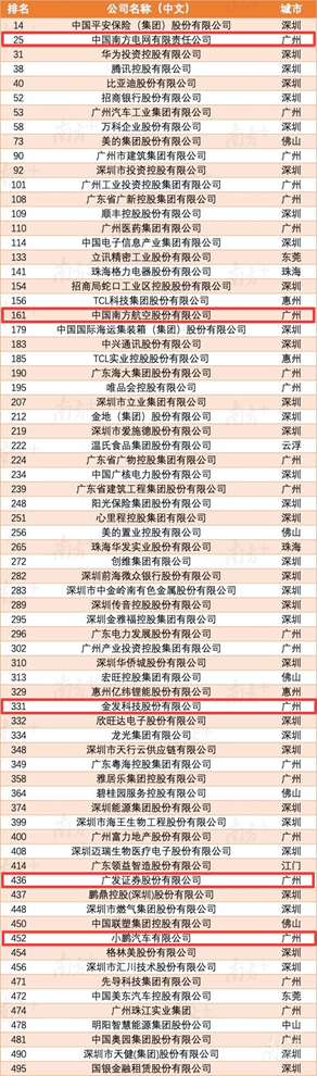 中国南方电网有限责任公司、中国南方航空股份有限公司、金发科技股份有限公司、广发证券股份有限公司、广东小鹏汽车科技有限公司入围《财富》中国500强的在粤企业名单。