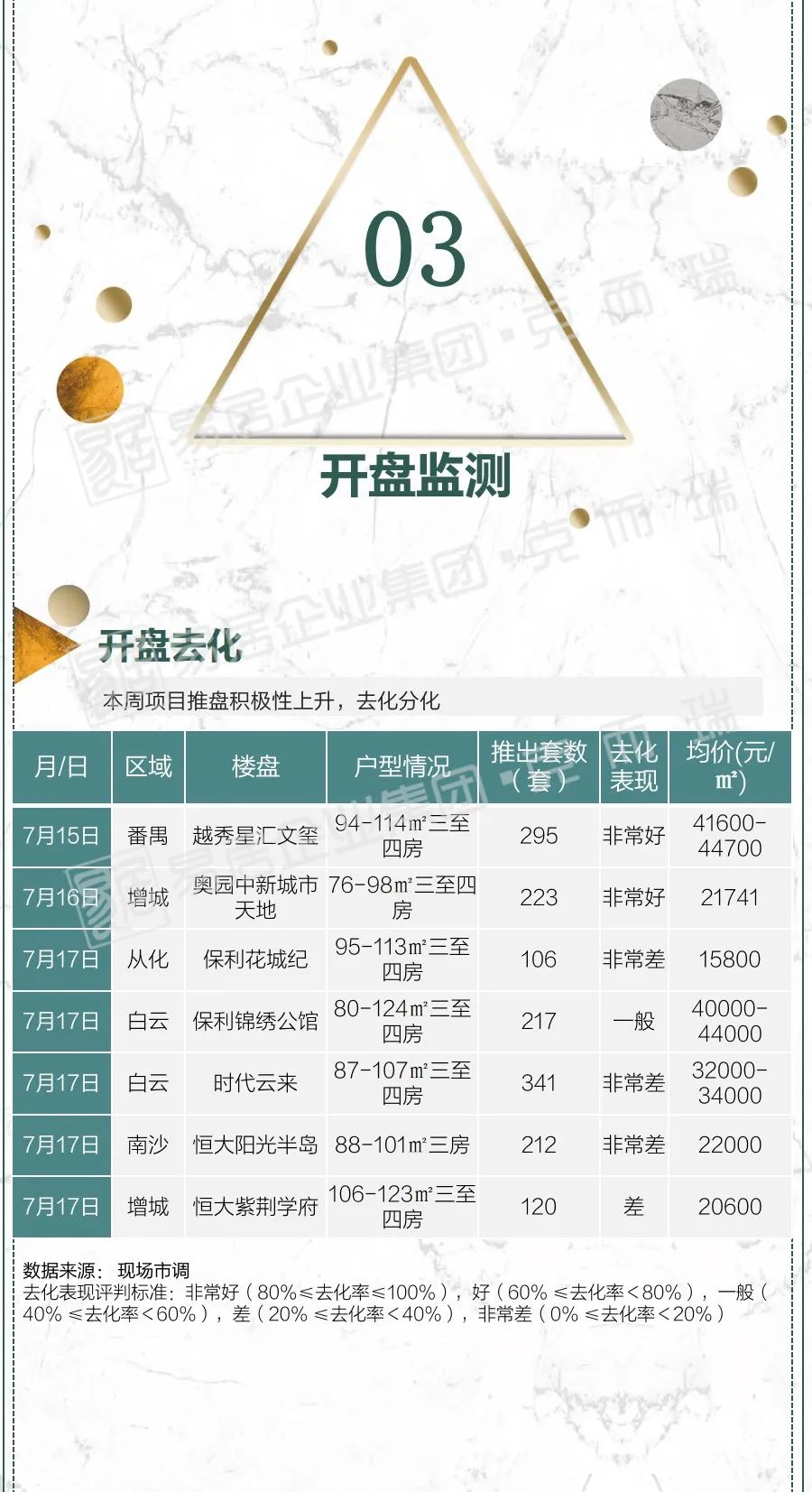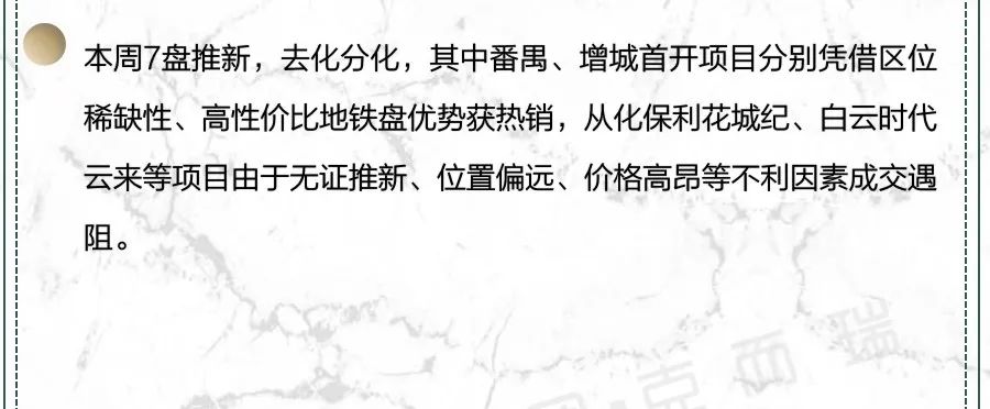 以往的供应大户增城区,则退居第二,上周供应新房467套;另外番禺、海珠、花都三区各有少量货量入市推售。
