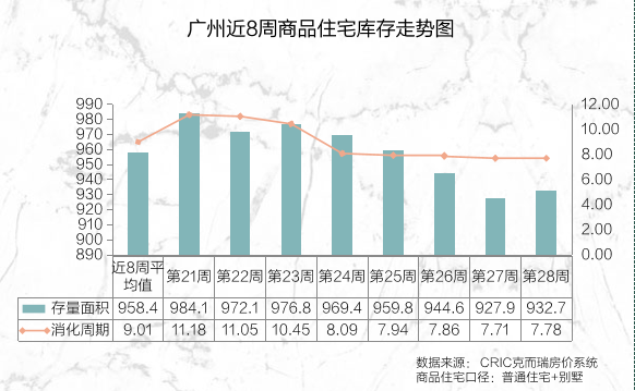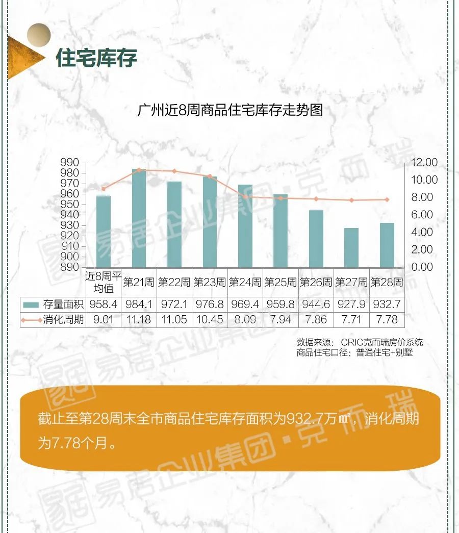 克而瑞统计到,截止至第28周末全市新房库存面积为932.7万㎡,去化周期为7.78个月。