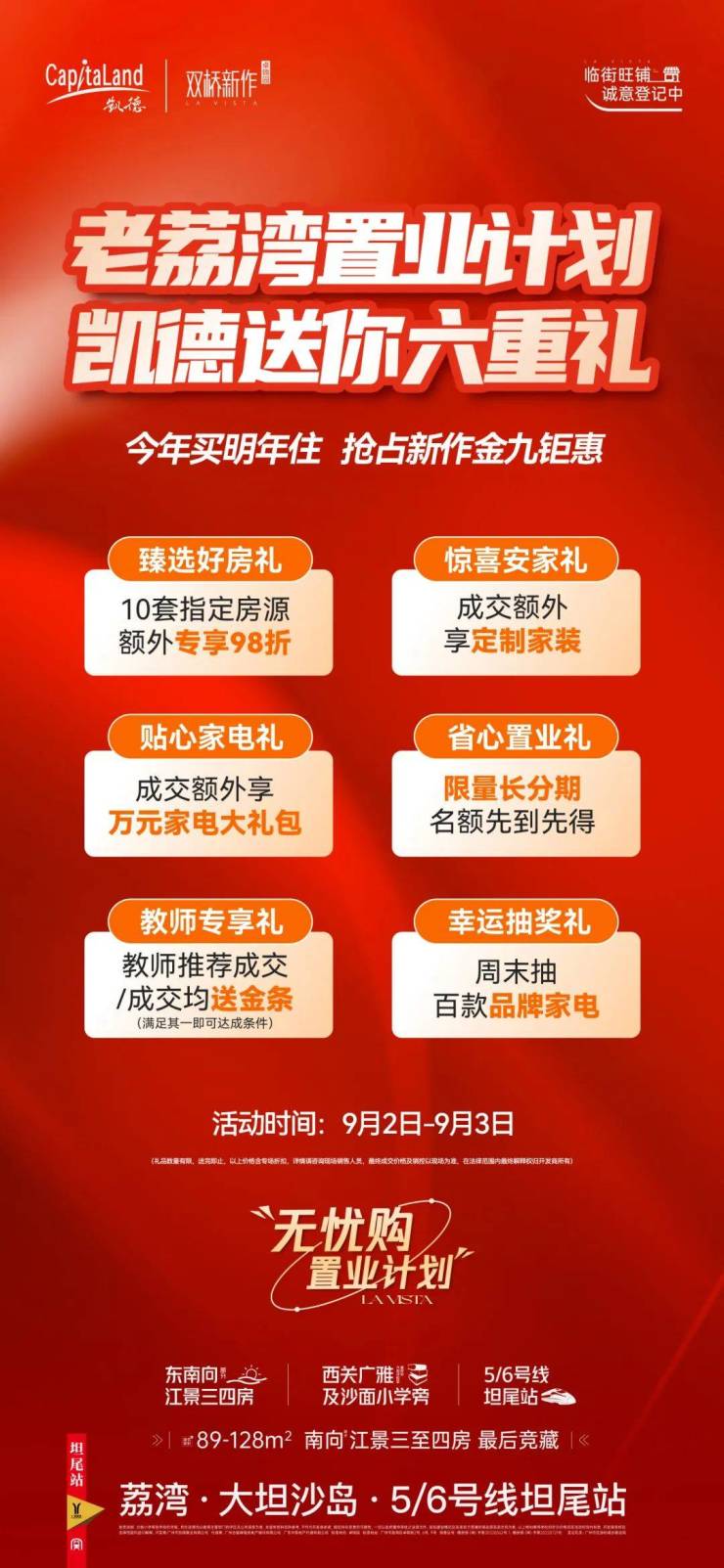 此外,部分楼盘还特别推出优惠活动,吸引购房者关注。如位于荔湾大坦沙岛的凯德·双桥新作推出10套指定房源,认购可专享98折。而且,认购成交后,还可额外享定制家装、万元家电大礼包等,数量有限,有意向的网友可要抓紧了哦。