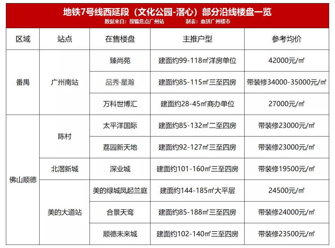 待途经天河、黄埔、番禺三区的7号线二期开通后,届时将极大满足广州东部片区南北方向的交通需求,其沿线楼盘较高售价为5.5万元/㎡。