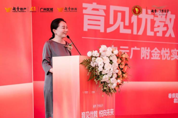 活动现场,越秀地产教育事业部总经理助理邱金鸽女士上台致辞,她表示百年大计,教育为本,作为深耕广州四十一年的广州老牌国企,越秀地产在发展人居版图的同时不忘履行社会责任,于2019年即开启了教育事业的布局。越秀教育定位新时代社区教育服务引领者,以业主为中心,以需求为起点,以社区为土壤,以服务为灵魂,围绕学前教育、基础教育、社区文化,打造全龄段教育生态,提供优质配套服务。目前已为越秀地产18个社区超 14.5 万名业主引入优质教育资源,整合基础教育头部力量,建立托幼一体学前教育体系,打造优质教育资源平台,提供超3万个学前教育和基础教育公办学位。