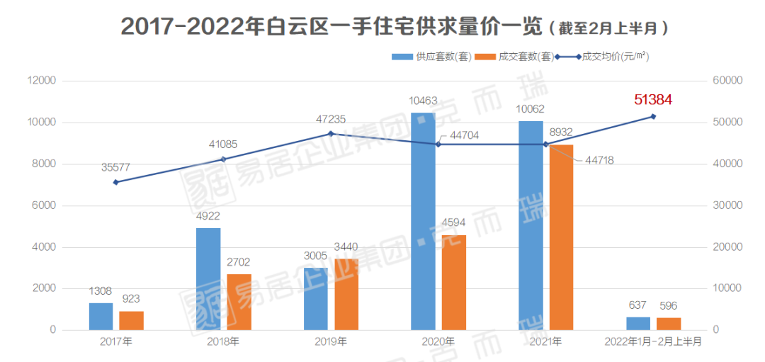 据统计,进入2022年(截至2月上半月),白云区挺进5字头均价,达到51384元/平。