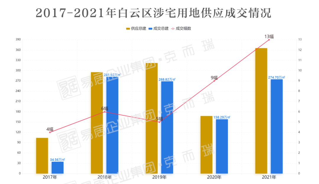 克而瑞数据统计,近年来白云区涉宅用地成交总建多在200万方左右,在上一年白云区通过招拍挂方式成交出让了13宗涉宅用地,为历年来出让宗数较高。