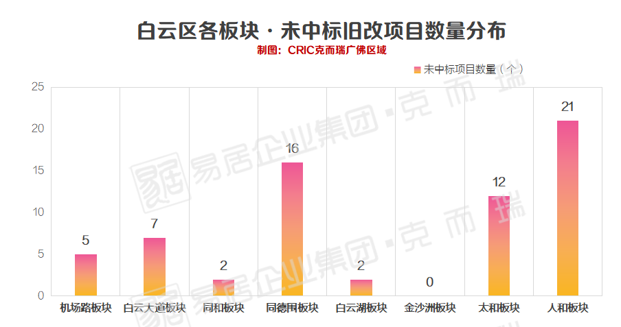 克而瑞研究部统计到,截至2021年底,白云区8个板块中,仅金沙洲板块无未中标旧改项目,其余均有分布,同德围、太和以及人和3板块中未中标项目数量较多。另外,在未中标的65村中,已有意向/前期意向/企业介入的则已有21村。