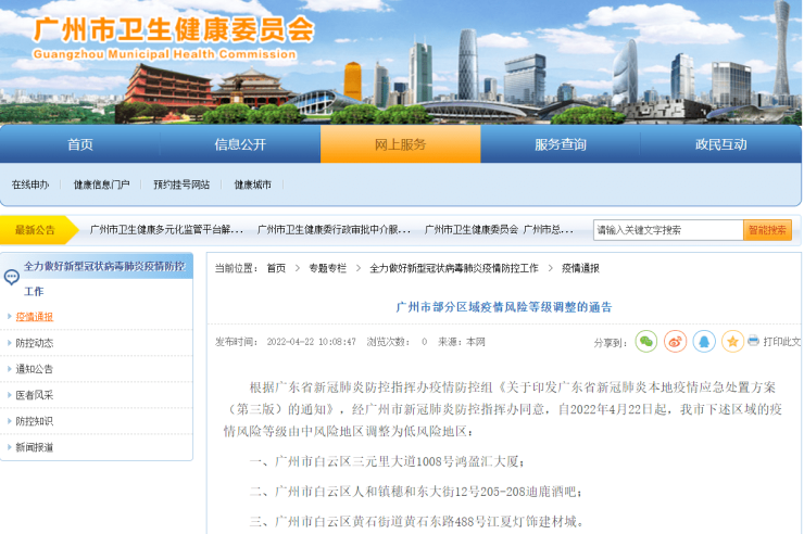 根据广东省新冠肺炎防控指挥办疫情防控组《关于印发广东省新冠肺炎本地疫情应急处置方案(第三版)的通知》,经广州市新冠肺炎防控指挥办同意,自2022年4月22日起,广州市下述区域的疫情风险等级由中风险地区调整为低风险地区: