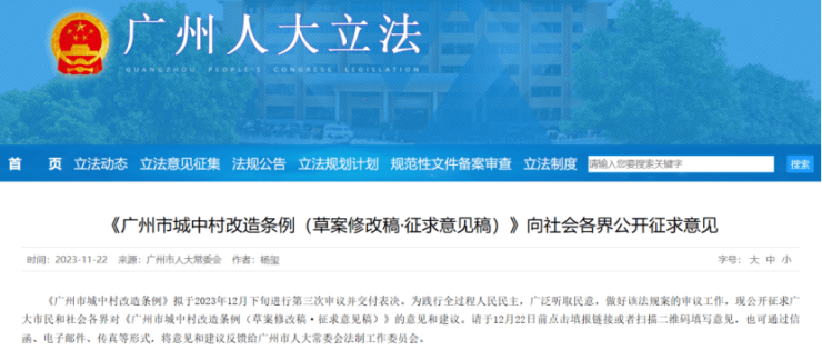 今年11月22日,广东省广州市人大常委会发布《广州市城中村改造条例(草案修改稿·征求意稿)》(下称《征求意见稿》),向社会各界公开征求意见,拟于12月下旬进行第三次审议并交付表决。