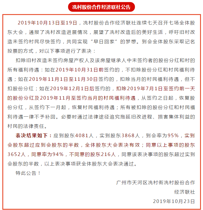 为解决这一难题,早在2019年10月,冼村城中村改造项目曾发布公告,对于未签约者,将扣除股份分红,必要时追究法律责任。