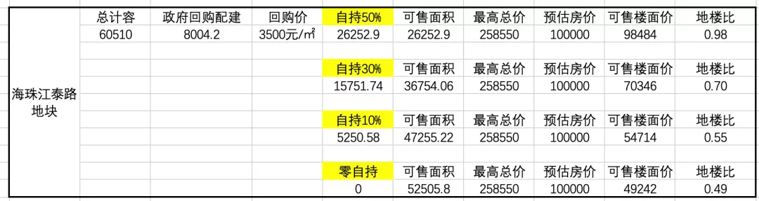 至于江泰路地块未来楼价要卖多少钱?据克而瑞数据分析,假设未来地块入市房价为10万元/㎡,当地块达到较高限价,并进入竞自持环节,当达到较高50%竞自持时,项目可售面积只剩26252.9平,此时地楼比为0.98;而若达到较高限价后,未进入竞自持环节,则可售面积为52505.8平,则此时地楼比为0.49,可售楼面价为49242元/㎡。