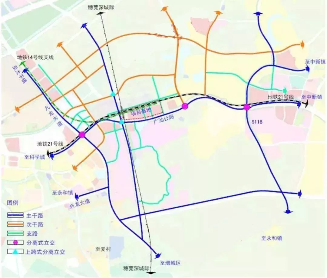 结合镇龙片区控制性规划,镇龙站交通枢纽片区路网体系由“两横三纵”骨干路网组成。枢纽外围主要包括:东西向的广汕公路,南北向的九龙大道和 S118。