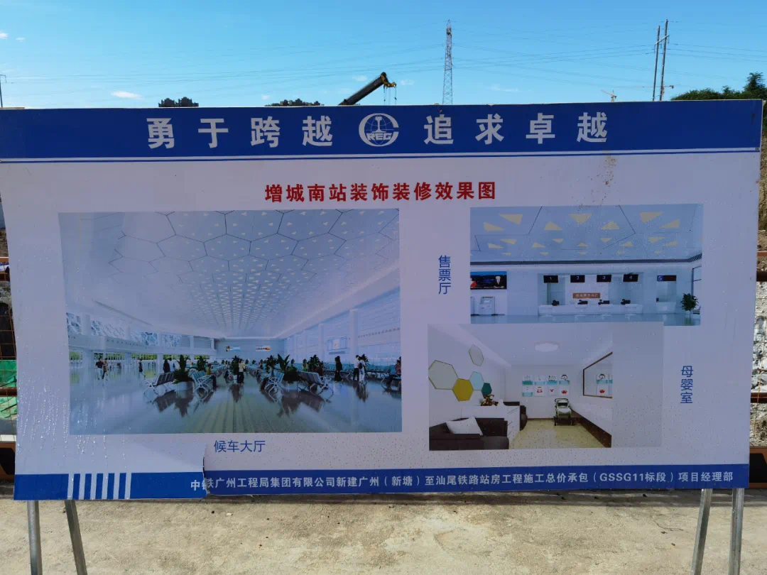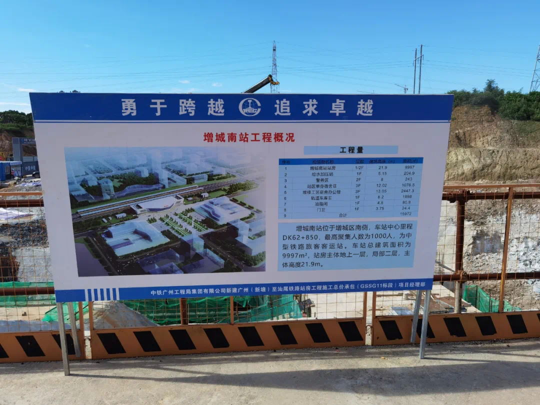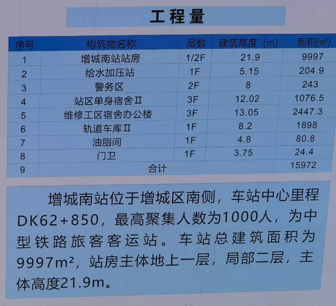 增城南站较高聚集人数为1000人,为中型铁路旅客客运站。车站总建筑面积为 9997㎡,站房主体地上一层,局部二层,主体高度21.9m。