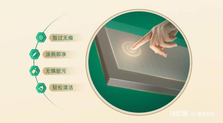 EB高能板通过高能量电子束在板材表面筑起3维交联立体结构,固化形成均匀且致密的EB涂层,具有良好的耐化学性和抗污效果,板材无惧指纹、涂鸦,高效抵御脏污,轻松清洁,干净如初。
